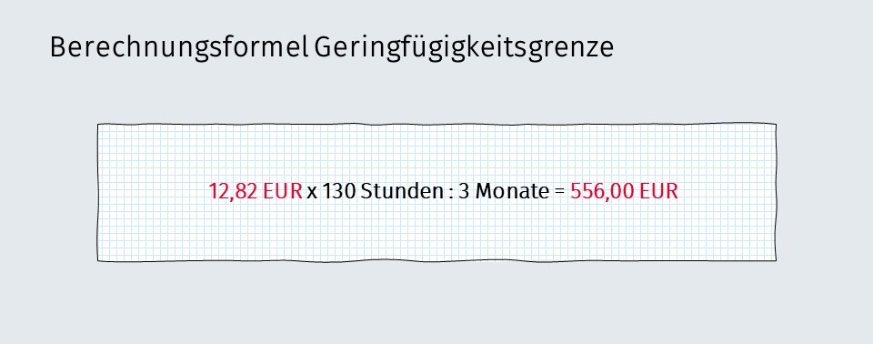 Die Geringfügigkeitsgrenze erhöht sich aufgrund der Anhebung des Mindestlohns zum 1. Januar 2025 auf 12,82 EUR brutto je Zeitstunde auf 556 EUR im Monat bzw. auf das Zwölffache (6.672 EUR) bei durchgehender mindestens zwölf Monate dauernder Beschäftigung gegen Arbeitsentgelt in jedem Monat. Hinsichtlich des gelegentlichen unvorhersehbaren Überschreitens gilt das Vierzehnfache (7.784 EUR).