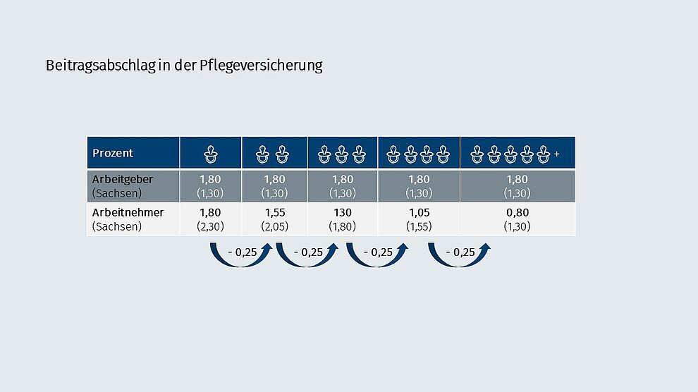 Für Arbeitnehmer mit Elterneigenschaft reduziert sich der Beitragssatz zur Pflegeversicherung für jedes berücksichtigungsfähige Kind ab dem zweiten Kind bis zum fünften Kind um jeweils einen Beitragsabschlag in Höhe von 0,25 Beitragssatzpunkten: